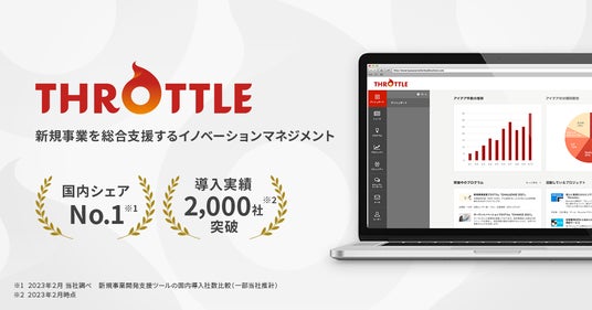 Throttleは新規事業創出プログラムや社内ベンチャー制度、オープンイノベーションやアクセラレーションプログラム等を含む、すべての新規事業開発やイノベーション創出のための活動に最適化された国内初にして国内シェアNo.1(※)SaaS型イノベーションマネジメント・プラットフォームです。
