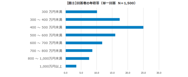 やりがいの1位となった「給与」について別設問で尋ねた結果、最も多い年収帯は「400~500 万円未満(25.0%)」ということが分かりました。一方で、500万円以上の年収帯も約半数(計47.5%)を占めていることが分かりました(【図8.】参照)。※1:その他を除く