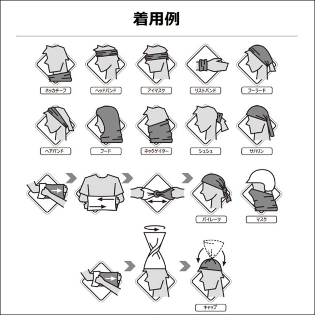 1枚で10通り以上の使い方が可能で、バンダナ・キャップ・ヘッドバンド・ネックウォーマー・ネッカチーフ・ヘアバンド・フェイスガード・フェイスマスク・キャップ・シュシュ・リストバンドなど、アレンジは自由自在。