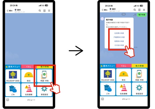 各種申請がLINE上で出来るようになる電子申請の機能を導入、行政手続きがオンラインで簡単にできるようになりました。