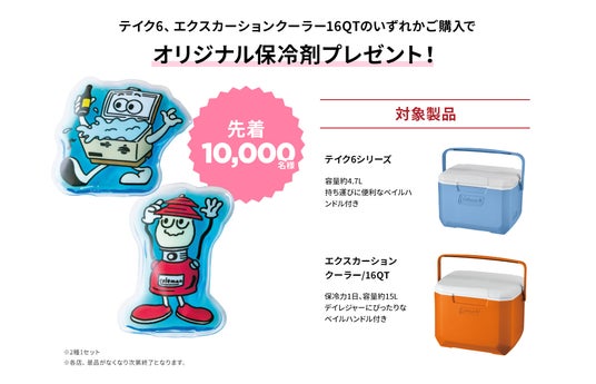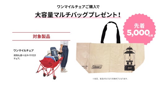 近所の公園などで気軽にアウトドアを楽しむ“ワンマイルピクニック”を応援!荷物も運べるタイヤ付きチェア「ワンマイルチェア」を購入すると、ワンマントルランタンがデザインされた大容量マルチバッグ(総勢先着5,000個)をプレゼント。また、コンパクトで持ち運びやすいハードク―ラー「テイク6」「エクスカーションクーラー/16QT」を購入するとコールマンのキャラクターがデザインされたオリジナル保冷剤をプレゼント(総勢先着10,000セット)いたします。