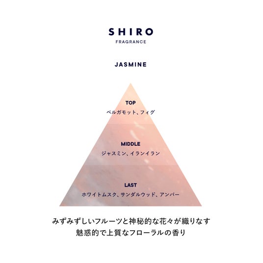 SHIROの前身ブランドであるLAUREL時代に、定番フレグランスとして誕生し、その後も多くのお客様から再販希望のお声をいただいていた「ジャスミン」の香り。過去3回に渡り、限定フレグランスとしても再登場しました。これまで愛されてきた特長は残しつつ、今回はより秋のムードを感じる、深みのある香りにアップデートすることで、フルーツと花々が神秘的に溶け合う新たな「ジャスミン」が誕生しました。