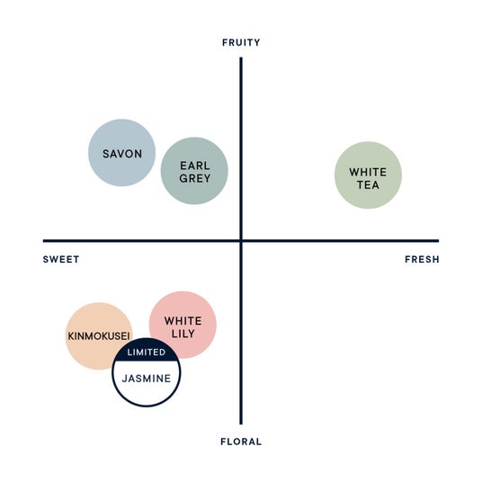 みずみずしいベルガモットとフィグが奏でる爽やかなトップノートから、ジャスミンとイランイランの甘さが光る華やかなミドルノートへ。ラストはやわらかなホワイトムスクと、あたたかみのあるサンダルウッドが気高く漂い、「花の王」とも呼ばれるジャスミンの奥深さを感じていただけます。