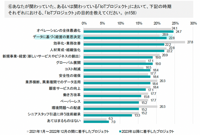 「2021年1月~2022年12月の間に着手したプロジェクト」と「2023年以降に着手したプロジェクト」で、それぞれの期間におけるIoTプロジェクトの目的を聞いたところ、目的の優先順位に変化が見られました。