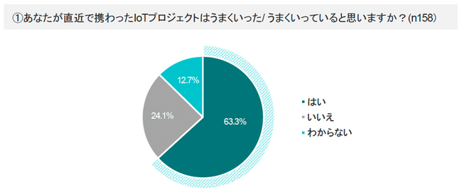 IoTプロジェクトがうまくいった(うまくいっている)と思うかどうかについて聞いたところ、63.3%が「はい」と回答。上場企業の6割以上がIoTプロジェクトに成功実感を得ていることが明らかになりました。