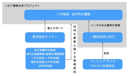 フィリップ モリス ジャパン合同会社(PMJ)の支援を受け、一般社団法人RCFが運営する岩手県二戸エリア(二戸市、一戸町、軽米町、九戸村)及び岩手町地域の農業の持続性向上に向けた農業振興プロジェクトです。