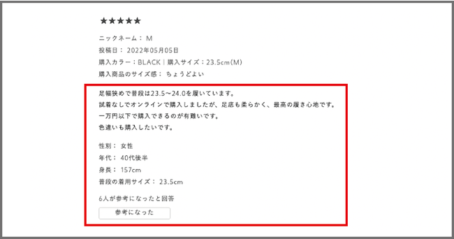投稿者のパーソナル情報(性別・年代・身長・フリーコメントなど)からどのようなユーザがどの商品を購入しているかが分かり、自分と関連性の高いレビューを参考にすることが可能です。
