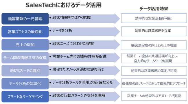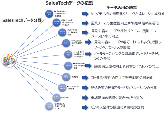 その理由は、これらのデータを活用することで、セールステックによるビジネス成果の最大化が可能となります。例えば、見込み客データを活用することで、ターゲティングの最適化が可能となり、見込み客の獲得効率が向上します。営業成績データを活用することで、営業チームの生産性向上や販売戦略の最適化が可能となり、売上高の拡大が期待できます。