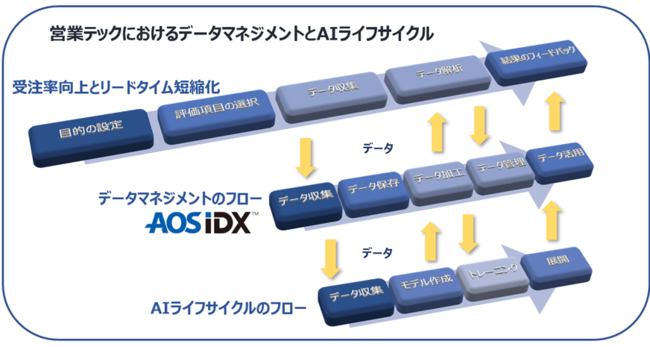 AOS IDXでは、こうしたAIライフサイクルの仕組みとマルチモーダルAIへの適用に基づき、AIデータにおけるAIシステムのためのAIデータ管理を行い、企業における優秀なデータがあって初めて優秀なAIシステムを実現できるというData to AIのコンセプトの元、AOS IDXによって、SalesTech分野における営業パフォーマンス向上に向けたプラットフォーム構築を支援します。