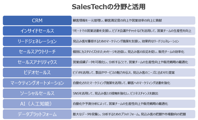 SalesTech市場は、世界中で急速に拡大しています。SalesTech(営業テック)とは、Sales(営業)とTechnology(技術)を組み合わせた言葉で、今話題のChatGPTに聞いたアドバイスを参考にすると、営業活動を支援するテクノロジーやソフトウェアの総称です。主に、営業プロセスの自動化、効率化、分析、改善などを行うために使用されます。営業チームがターゲット市場に向けてより的確かつ迅速にアプローチし、ビジネス成果を向上させることを目的としています。
