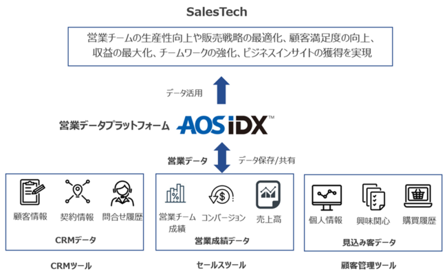 クラウドデータ、システムデータ、リーガルデータ、AIデータなどのデータアセットマネジメント事業を展開するAOSデータ株式会社(本社:東京都港区、代表取締役社長 春山 洋 以下 AOS データ社)は、SalesTechにおける営業の最適化や生産性効率化につながる営業データの保存管理やデータのリスク管理までデータを総合的にマネジメントし、AIによるデータ分析や活用につなげることができる営業パフォーマンス向上のためのデータマネジメント製品「営業データプラットフォーム AOS IDX」(https://AOSIDX.jp/)のInside実装サービスを、2023年4月11日より販売開始することをお知らせします。