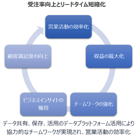 データ共有、保存、活用のデータプラットフォームにより、データを収集し、AIによる分析・活用をすることによって、営業の受注率向上やリードタイムの短縮化において、データプラットフォームの導入は大きな役割を果たします。