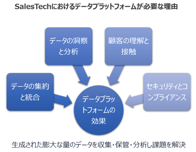 SalesTechの目的は、営業活動の効率化や効果的な営業活動の実現、顧客満足度の向上、収益の最大化、チームワークの強化、ビジネスインサイトの獲得などがあります。セールステックにおいてデータプラットフォームを導入することで様々な効果が得ることができます。