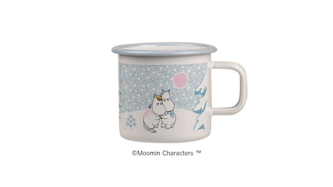 ムーミンとスノークのおじょうさんが雪遊びをしている限定柄のマグカップ
