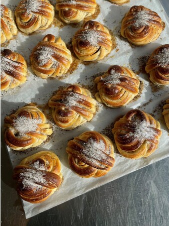 丸パンにカルダモンが練り込まれたアーモンドフィリングとホイップクリームが詰まったスウィーツ