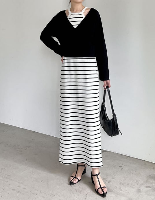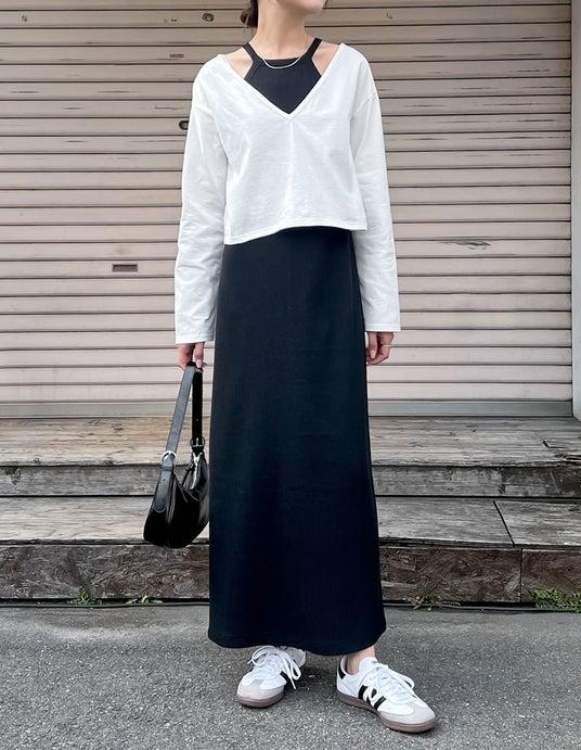 ワンピースは1枚で着用できるパッド付きで、簡単にお洒落見えするアメスリデザインがポイント。