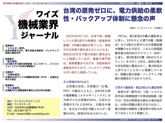 ワイズコンサルティング グループ(本社:中華民国台北市、代表取締役:吉本康志)は台湾機械業界専門誌「ワイズ機械業界ジャーナル」の2025年5月第4週号を発行しました。今号では、台湾唯一の原子力発電所の運転終了に伴う「原発ゼロ」状態での夏を迎える中、電力供給の柔軟性やバックアップ体制への懸念を取り上げました。さらに、LED最大手の富采投資控股(エノスター)によるシリコンフォトニクス光源開発の進展、PUメーカーから半導体材料メーカーへと転身した頌勝科技材料(PVI)の成功事例、そして台湾動力手工具業界の最新見通しなど、台湾の製造業が直面する転機と挑戦を多角的に分析しています。