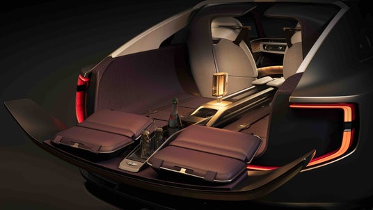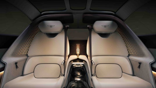 キャビン後部には、乗員の心と身体の安らぎを高めるウェルビーイングスペースが設けられており、そこにはシルクのジャカード織物が使われています。このファブリックは、1903年創業の英国の老舗ミル「ゲインズバラ」社が製造したもので、1980年以来、英国王室にも納入されている格式高い素材です。こうした伝統的な素材に加え、EXP 15では革新的な新素材も随所に採用されています。例えば、「アクリル クチュール」と呼ばれる、金属メッシュをアクリルで封入した素材は、照明と組み合わせることでダッシュボードに鮮やかな立体感(3D効果)を生み出します。さらに、ベントレーを象徴するキルティング模様が施されたドアパネルなどの内装部には、カットされた突き板の裏側にバックライト素材を仕込み、光によって浮かび上がる未来的な演出を可能にしています。