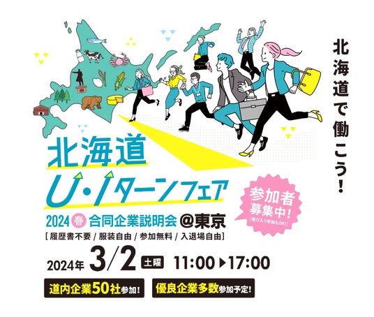 北海道へU・Iターン就職を希望する方(学生を含む)を対象に道内の魅力あふれる企業50社や関係団体等が参加します。