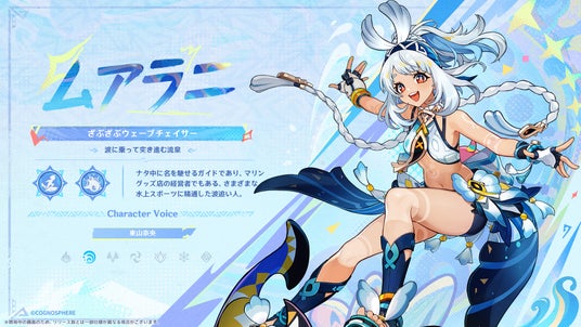 流泉の衆の出身で、頼れる仲間「ざぶざぶサメくん」に乗って、水上のほか、流れる燃素の上や平地をもサーフィンするかのように移動できる。戦闘中、ムアラニが乗ったサーフボードは、敵にマークを付け、「サメサメバイト」で敵に噛みつく。さらに、敵に一定回数触れると、より大きい水元素ダメージを与えることができる。