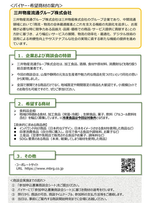 本商談会のバイヤーである三井物産流通グループは、日本全国の小売業、外食産業を中心に、加工食品・酒類・総菜・包材・物流など、多彩なサービスを提供しております。