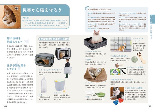 地震や洪水といった災害への備えや対策、高齢猫にとって快適な環境づくりやお世話の仕方、かかりやすい病気などの情報も詳しく解説しました。子猫から高齢猫まで、猫との暮らしをサポートする情報が満載です。