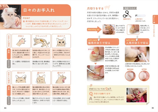 爪切り、ブラッシングなど日々のお手入れの仕方を写真付きで解説しています。