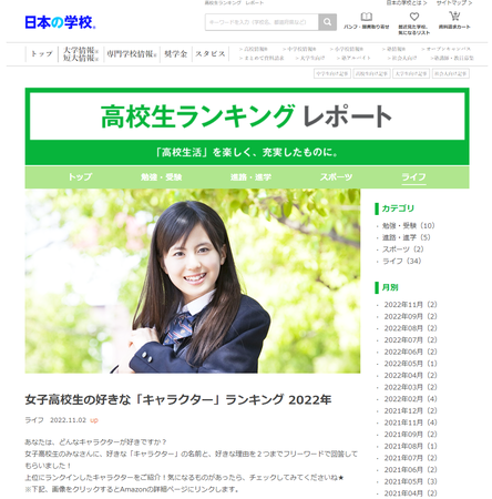 高校生ランキングレポート「女子高校生の好きな「キャラクター」ランキング2022年」:https://school.js88.com/koukousei/life/53