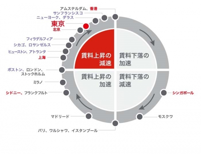 ※5 世界の主要都市の賃料動向を時計に見立てて“見える化”したJLL独自の市場分析ツールで、四半期ごとに発表しています。