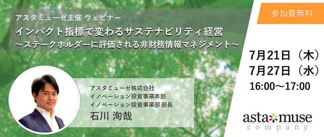 この度、アスタミューゼ株式会社(本社:東京都千代田区、代表取締役社長 永井歩)は、「インパクト指標で変わるサステナビリティ経営~ステークホルダーに評価される非財務情報マネジメント~」と題し、無料ウェビナーを開催いたします。