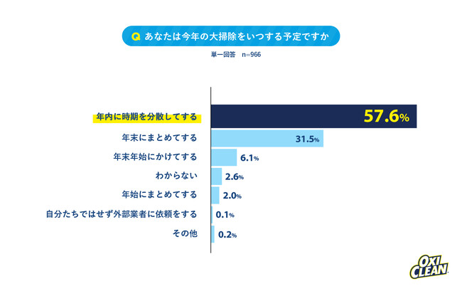そこで、大掃除をする予定の人に実施時期をたずねたところ「年末にまとめてする」という人を抑え、57.6% の人が「年内に時期を分散してする」ことがわかりました。
