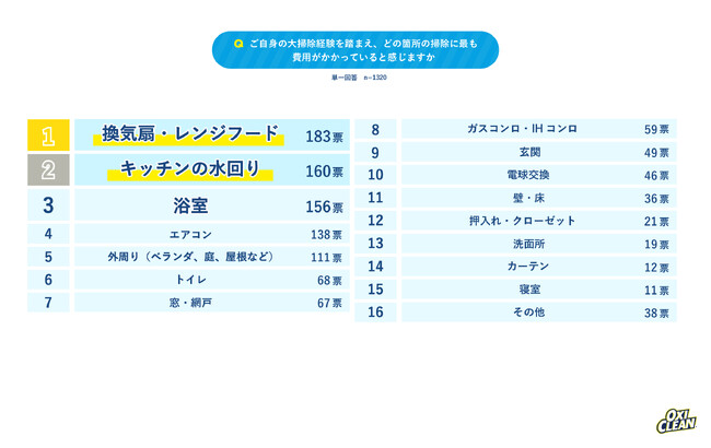 大掃除の際に最も費用がかかる箇所をたずねたところ「換気扇・レンジフード」「キッチンの水回り」が1位、2位と続くことから、多くの方がキッチン周りの掃除に費用をかけていることが明らかになりました。特に「換気扇・レンジフード」につきやすい油汚れは放置してしまうと落としづらく、専用洗剤や業者を使いたい という方が多いことが予想されます。