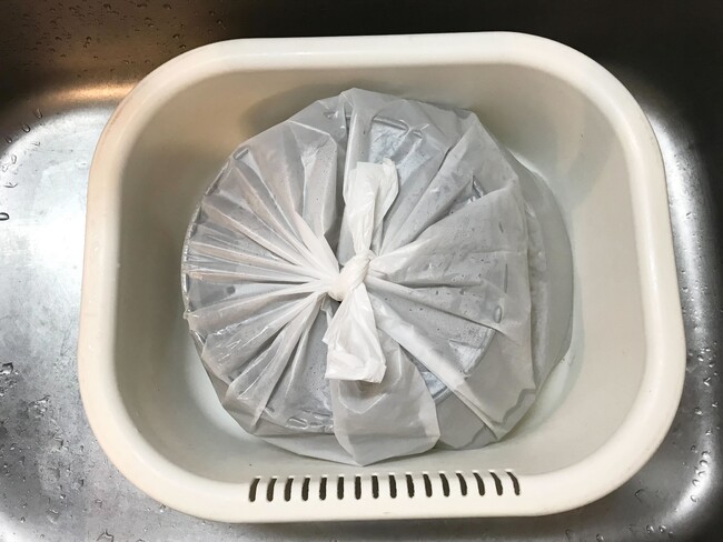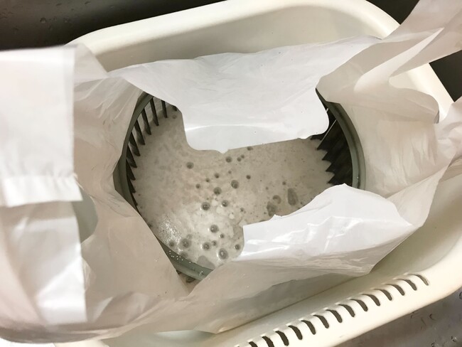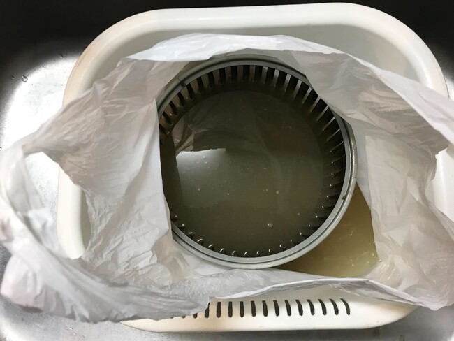 二重にしたビニル袋の中に、50℃程度のお湯を入れてオキシクリーンを溶かします。そこに換気扇を漬けおくだけです。汚れの落ち具合を見ながら、30分程度、漬けおいたらお湯ですすいで完了。フチに残った汚れは、使い古しの歯ブラシを使って落とすとよいでしょう。