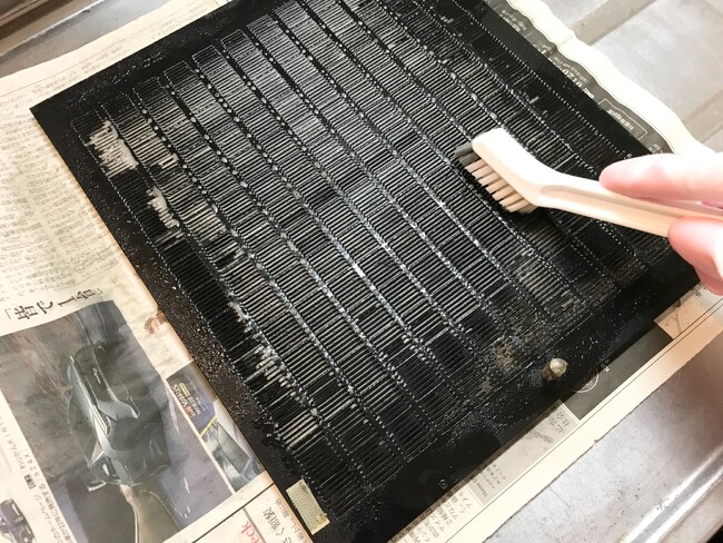 フィルターの汚れは、洗剤を直接かけて落としていきます。これもアルカリ電解水を使用しました。全体にまんべんなくスプレーしたら、固めのブラシでこすっていきます。お湯でしっかりとすすいでください。