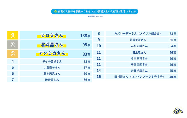 その他、明るく掃除を盛り上げてくれそうな「アンミカさん」や、ママタレントとして人気の「ギャル曽根さん」「小倉優子さん」「藤本美貴さん」「辻希美さん」が掃除を手伝ってほしい芸能人上位にランクインしました。