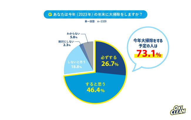 「今年の年末に大掃除をする予定」と回答した人は合計73.1%(「必ずする」(26.7%)、「すると思う」(46.4%)の合計)いることが明らかになりました。