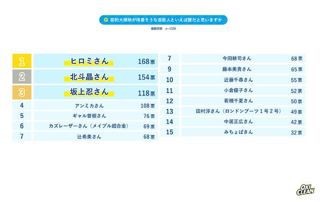 節約大掃除が得意そう、自宅の大掃除を手伝ってもらいたい芸能人と言えば誰か、それぞれたずねたところ、第1位は「ヒロミさん」という結果になりました。