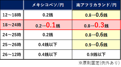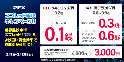 さらに2月15日より「南アランド/円」は今までのキャンペーンに追加で、24時~26時の時間帯にスプレッドを「0.6銭」に縮小いたします。