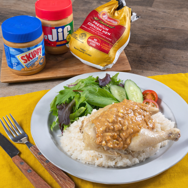 本レシピは、丸ごと調理が可能な小さな丸鶏「ゲームヘン」を使用することで、日常的な取り入れやすさを実現するとともに、ピーナッツバターを調味料として使用したソースを開発し、ピーナッツバターの新たな使い方を提案しています。