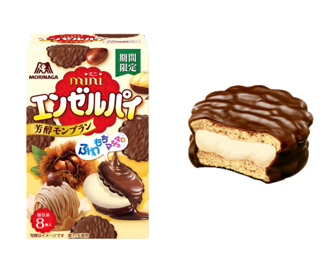 モンブランペーストを練り混んだしっとりビスケットでふわもちマシュマロをサンドし、やさしい味わいのチョコレートでコーティングしたひとくちサイズのミニエンゼルパイ。