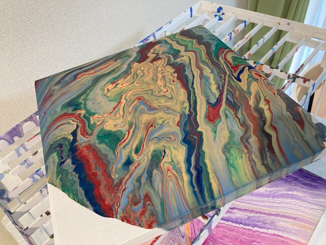数種類のアクリル絵の具をキャンバスに垂らし、流動性を生かして描く技法。キャンバスを傾けたり、手で絵の具を広げたりして、作品を仕上げます。