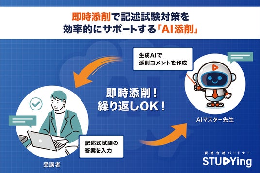 オンライン資格取得講座「STUDYing(スタディング)」を提供するKIYOラーニング株式会社(東京都千代田区、代表取締役社長:綾部貴淑)は、対策が難しいとされる記述式試験において、生成AIを活用して受講生の答案に個別添削を実施する「AI添削」機能を新たにリリースいたしました。学習を止めない「即時添削」とAIだからこそ可能な「繰り返し添削」によって、忙しくて時間がない受験生の”効率的な学習”サポートを一層強化してまいります。