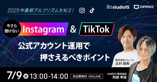 株式会社ラバブルマーケティンググループ(本社:東京都港区、代表取締役社長:林雅之、証券コード:9254)の子会社で、企業のSNSマーケティングを支援する株式会社コムニコ(本社:東京都港区、代表取締役:長谷川 直紀)は、TikTokを中心としたショートムービー(短尺動画)領域で広告代理店事業・プロダクション事業を展開するstudio15株式会社(本社:東京都渋谷区、代表取締役:岩佐琢磨)と、2025年7月9日(水)13時、無料オンラインセミナー「2025年最新アルゴリズムを知る!今さら聞けないInstagram & TikTok公式アカウント運用で押さえるべきポイント」を開催いたします。