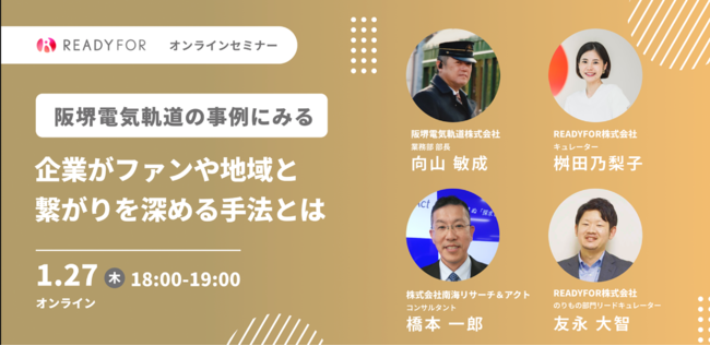 日本初・国内最大級のクラウドファンディングサービス「READYFOR」を運営するREADYFOR株式会社 は、2022年1月27日(木)にウェビナー「阪堺電気軌道の事例からみる 企業がファンや地域と繋がりを深める手法とは」を開催いたします。