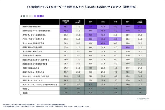 また、年代別で見ると「あせらず、ゆっくり注文できる」は特に20代が他の年代よりも高い結果となり、若年層からは「待ち時間が減る」というタイムパフォーマンスの側面だけでなく、周囲の環境や状況に左右されずに「自分のペースを保って注文できる」という側面でも強く支持されていることが伺えました。