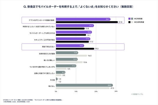 一方で、モバイルオーダー利用者と非利用者に、モバイルオーダーのデメリットを聞いたところ、ともに「アプリのダウンロードや登録が面倒」が最多となりました。
