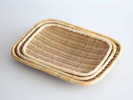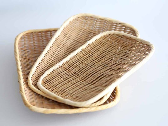 素材には、吸水性と強度に優れた天然竹を使用し、一つ一つの竹ひごはカマボコのような形状になっています。この構造により、食材から出た余分な水分を素早く逃がし、食材本来の美味しさを保つことができます。また、縁の部分には、美しく巻かれた籐が施されており、職人による手作業の細やかさと美しさを感じられる仕上がりとなっています。