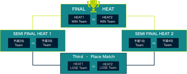 決勝トーナメントは、予選を勝ち上がってきた4チームによる1対1のトーナメント形式。セミファイナル(準決勝 HEAT 1、HEAT 2)は、各チーム1フライトを実施。予選期間中にセミファイナル用に計測したタイムを使用して対戦。HEAT 1とHEAT 2の各勝者がファイナル(決勝)へ進出。ファイナル(決勝 FINAL HEAT)は2チームで最終決戦を実施。予選期間中にファイナル用に計測したタイムを使用して対戦。勝者が大会の優勝となります。