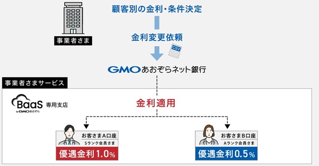 このたび、「BaaS byGMOあおぞら」で提供している個人向けの専用支店をご利用の事業者さま向けに、新たなサービスとして事業者さまの施策等に合わせて、お客さま口座(円普通預金口座)ごとの金利を柔軟に設定できる「個別金利設定サービス」を自社開発し、12月21日より提供を開始します。