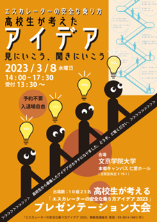 文京学院大学(学長:櫻井隆)は、エスカレーターの日※とされる3月8日(水)に、1都3県(東京都・埼玉県・神奈川県・千葉県)の高校生を対象に募集した「エスカレーターの安全な乗り方アイデア2023」の最終プレゼンテーション大会を開催いたします。
